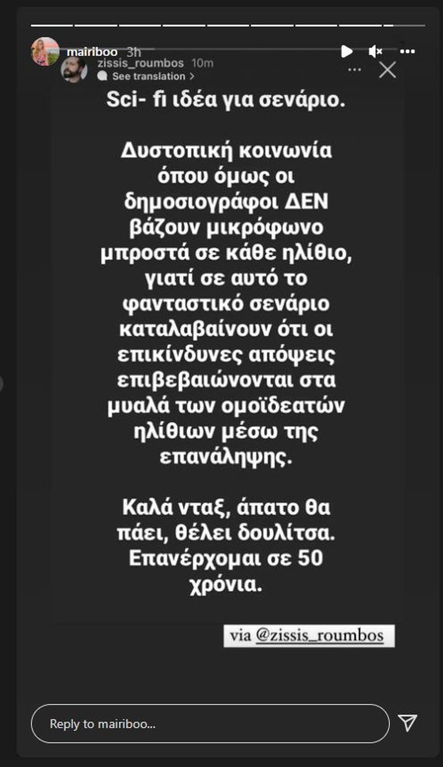 Στην συνέχεια η Μαίρη Συνατσάκη επανήλθε με νέο instastory στο οποίο έδινε ιδέα για σενάριο ταινίας επιστημονικής φαντασίας το οποίο αναδημοσίευσε από τον ηθοποιό Ζήση Ρούμπο.