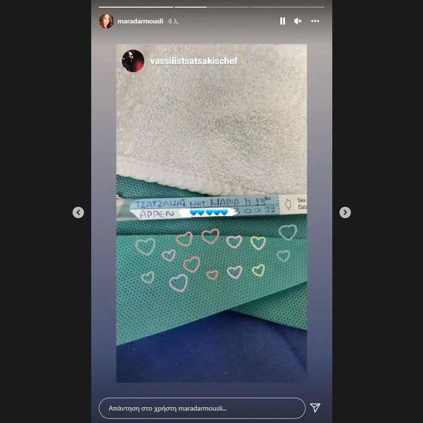 Το ευχάριστο γεγονός ανακοίνωσε ο σύζυγος της Μάρας Δαρμουσλή μέσω ενός instastory στον προσωπικό του λογαριασμό στο Instagram. Συγκεκριμένα ο Βασίλης Τσατσάκης δημοσίευσε μία φωτογραφία στην οποία φαίνεται το βραχιολάκι του νεογέννητου μωρού.