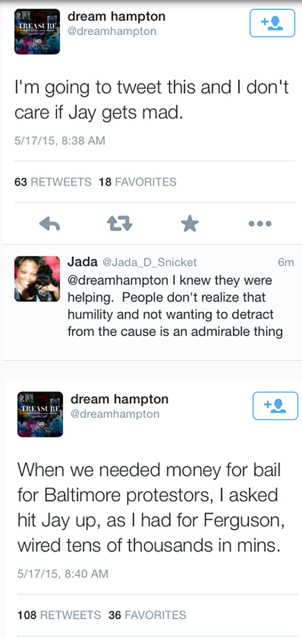 «Όταν χρειαζόμασταν χρήματα για (να πληρώσουμε) τις εγγυήσεις των διαδηλωτών στη Βαλτιμόρη, εγώ… έστελνα μήνυμα στον Jay, όπως το είχα κάνει και στο Φέργκιουσον (και εκείνος) μου έστελνε δεκάδες χιλιάδες» δολάρια εντός ολίγων λεπτών, έγραψε η ίδια σε ένα από τα μηνύματα.