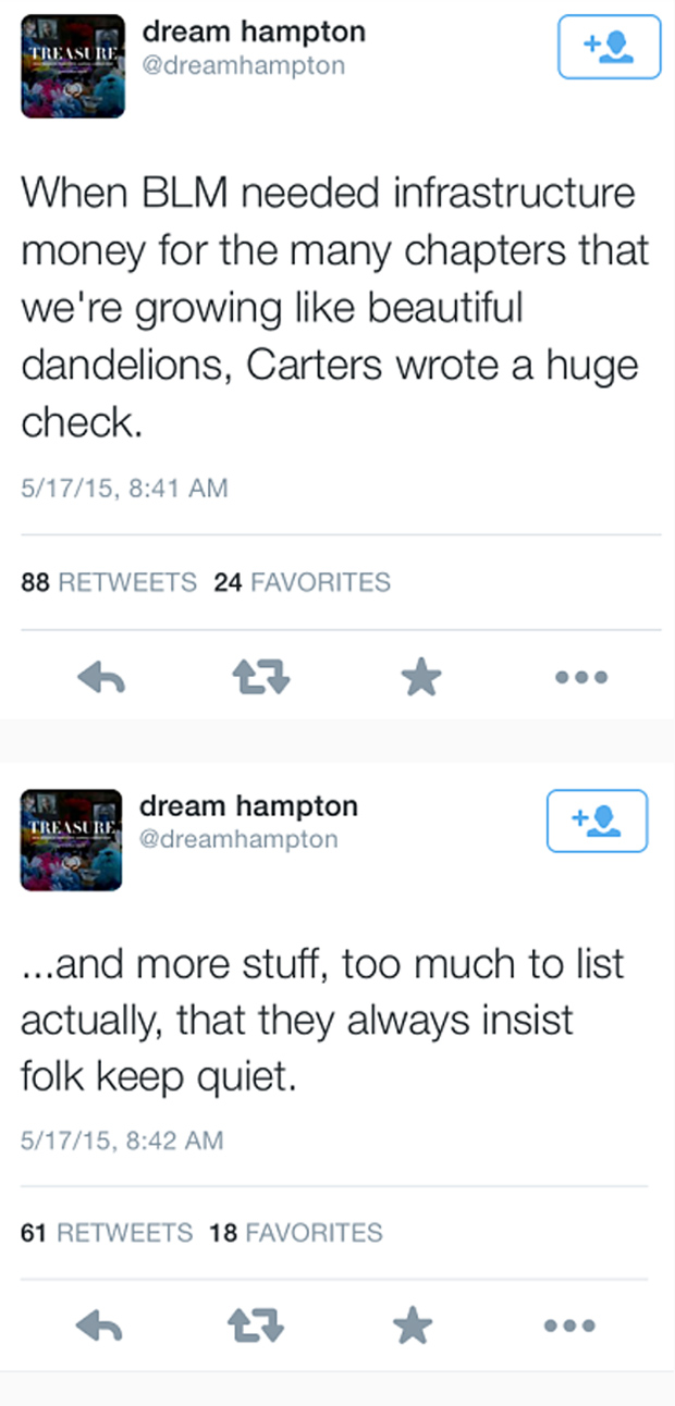 Η συγγραφέας αποκάλυψε επιπλέον ότι ο Jay-Z και Beyonce υπέγραψαν μία «παχυλή επιταγή» προκειμένου να στηρίξουν το κίνημα Black Lives Matter («Οι ζωές των μαύρων έχουν σημασία»), ένα από τα σλόγκαν που χρησιμοποιούσαν κατά κόρον οι διαδηλωτές στις κινητοποιήσεις αυτές.