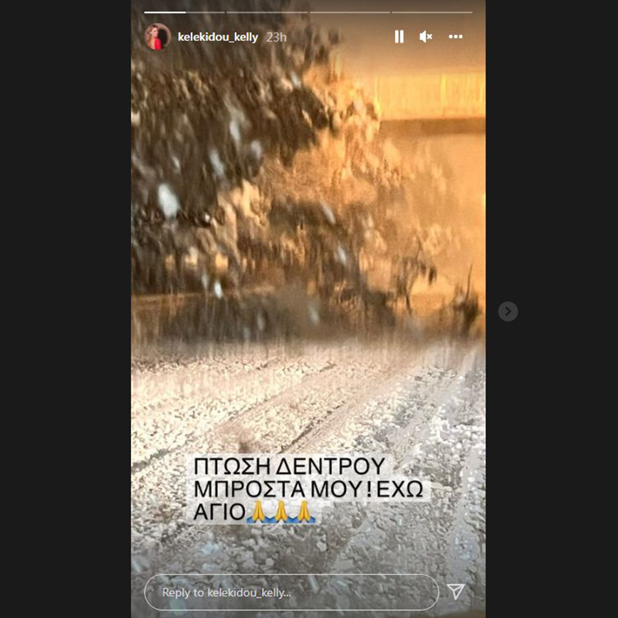 Ανάμεσα τους και η Κέλλυ Κελεκίδου η οποία, μέσω του προσωπικού της λογαριασμού στο Instagram γνωστοποίησε στους διαδικτυακούς της φίλους πως την ώρα που οδηγούσε ένα δέντρο έπεσε μπροστά της.