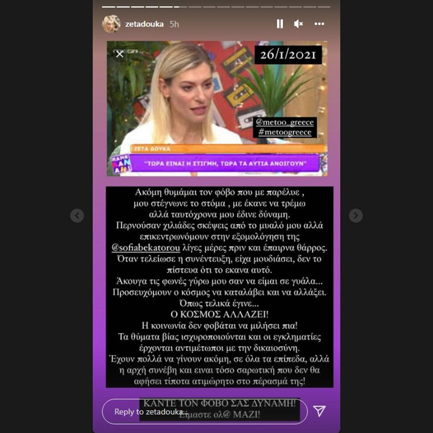 Όταν τελείωσε η συνέντευξη είχα μουδιάσει, δεν το πίστευα ότι το έκανα αυτό. Άκουγα τις φωνές γύρω μου σαν να είμαι σε γυάλα. Προσευχόμουν ο κόσμος να καταλάβει και να αλλάξει. Όπως τελικά έγινε. Ο ΚΟΣΜΟΣ ΑΛΛΑΖΕΙ. Η κοινωνία δεν φοβάται να μιλήσει πια.Τα θύματα βίας ισχυροποιούνται και οι εγκληματίες έρχονται αντιμέτωποι με την δικαιοσύνη. Έχουν πολλά να γίνουν ακόμη, σε όλα τα επίπεδα, αλλά η αρχή συνέβη και είναι τόσο σαρωτική που δεν θα αφήσει τίποτα ατιμώρητο το πέρασμά της», έγραψε η Ζέτα Δούκα.