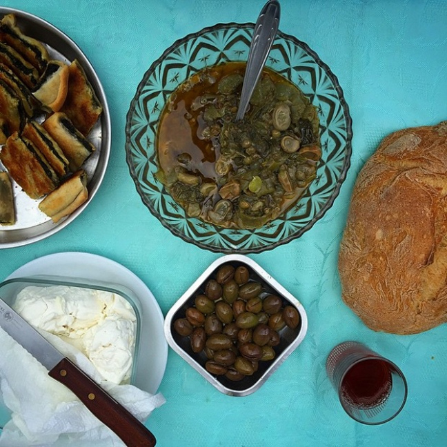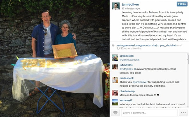 «Μαθαίνοντας πως φτιάχνεται ο τραχανάς από την αγαπητή κυρία Μαρία. Είναι ένα ιστορικά υγιεινό πιάτο, με σιτάρι ολικής άλεσης μαγειρεμένο με κατσικίσιο ξυνόγαλα που στεγνώνει στον ήλιο… Ένα τεράστιο ευχαριστώ σε όλους τους καταπληκτικούς ανθρώπους που γνώρισα και συνεργάστηκα στην Ικαρία. Αυτό το νησί άγγιξε την καρδιά μου. Ένα μέρος ξεχωριστό με υπέροχη φύση. Ανυπομονώ να ξαναπάω», έγραψε κάτω από τη φωτογραφία με την Ικαριώτισα, κυρία Μαρία.