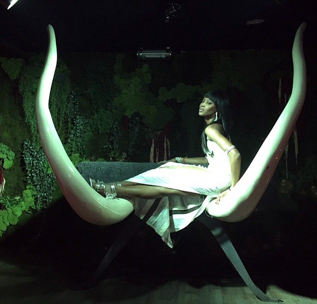 Ένας ολόκληρος τοίχος στο κάστρο ήταν καλυμμένος από τα πολλαπλά εξώφυλλα περιοδικών που έχουν κατά καιρούς φιλοξενήσει το σούπερ μόντελ και η Κάμπελ δεν δίστασε να φωτογραφηθεί μπροστά από αυτά, αποδεικνύοντας ότι παρά τα 45 της χρόνια διατηρεί ένα εκρηκτικό και άκρως εντυπωσιακό κορμί.