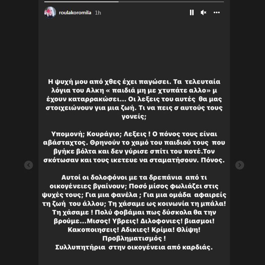 «Η ψυχή μου από χθες έχει παγώσει. Τα τελευταία λόγια του Άλκη “παιδιά μη με χτυπάτε άλλο” μέ έχουν καταρρακώσει… Οι λέξεις του αυτές θα μας στοιχειώνουν για μια ζωή. Τι να πεις σε αυτούς τους γονείς; Υπομονή; Κουράγιο; Λέξεις! Ο πόνος τους είναι αβάσταχτος. Θρηνούν τον χαμό του παιδιού τους που βγήκε βόλτα και δεν γύρισε σπίτι του ποτέ. Τον σκότωσαν και τους ικέτευε να σταματήσουν. Πόνος» έγραψε αρχικά η Ρούλα Κορομηλά.