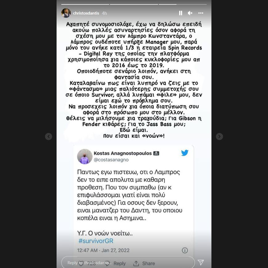 Η καυστική απάντηση του Χρήστου Δάντη ήρθε μέσω του Instagram ενώ δεν δίστασε να χαρακτηρίσει τον Κώστα Αναγνωστόπουλο ως «συνωμοσιολόγο»