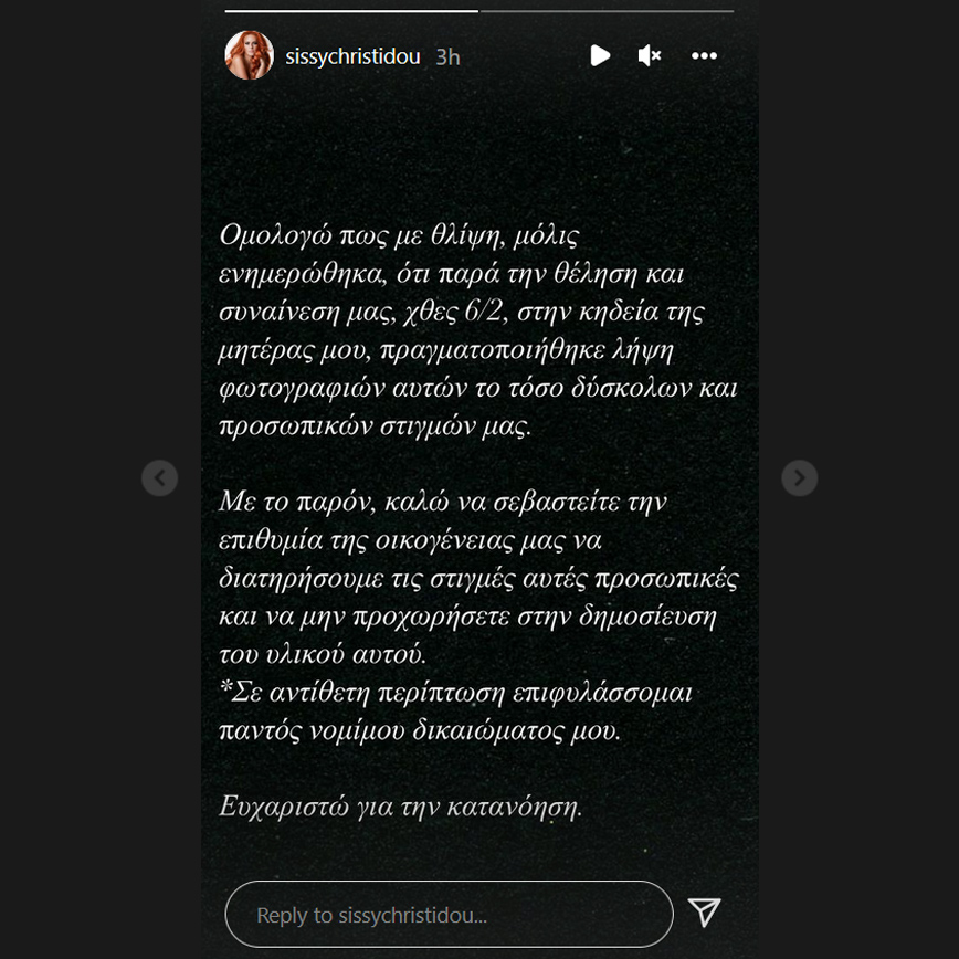 «Σας ευχαριστώ μέσα από την καρδιά μου για όλο αυτό το τεράστιο κύμα αγάπης» έγραψε η Σίσσυ Χρηστίδου αρχικά. Λίγη ώρα αργότερα, επανήλθε με νέα ανάρτηση στην οποία έγραψε: «Ομολογώ πως με θλίψη, μόλις ενημερώθηκα ότι παρά τη θέληση και τη συναίνεσή μας, χθες 6/2, στην κηδεία της μητέρας μου, πραγματοποιήθηκε λήψη φωτογραφιών αυτών των τόσο δύσκολων και προσωπικών στιγμών μας. Με το παρόν, καλώ να σεβαστείτε την επιθυμία της οικογένειάς μας να διατηρήσουμε τις στιγμές αυτές προσωπικές και να μην προχωρήσετε στην δημοσίευση του υλικού αυτού. * Σε αντίθετη περίπτωση επιφυλάσσομαι παντός νομίμου δικαιώματός μου. Ευχαριστώ για την κατανόηση».