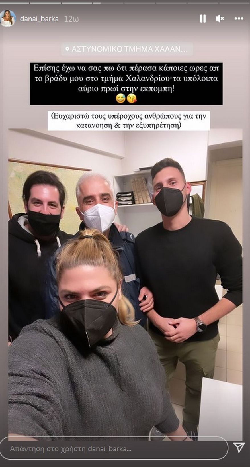 Στο αστυνομικό τμήμα Χαλανδρίου βρέθηκε τη νύχτα η παρουσιάστρια Δανάη Μπάρκα. Μάλιστα ανέβασε και ένα ποστ στο Instagram στο οποίο έλεγε πού βρισκόταν και υποσχόταν να μιλήσει στην εκπομπή της για το τι είχε συμβεί. Όπως και έκανε σήμερα στο «Πάμε Δανάη!».