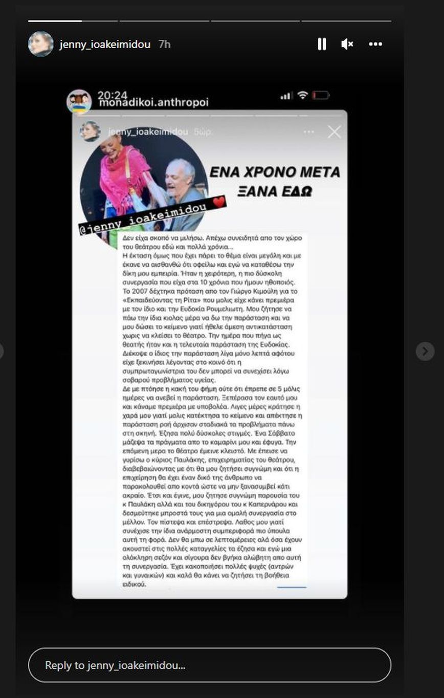 Ολόκληρη η ανάρτηση της Τζένης Ιωακειμίδου είχε ως εξής: Δεν είχα σκοπό να μιλήσω. Απέχω συνειδητά απο τον χώρο του θεάτρου εδώ και πολλά χρόνια.