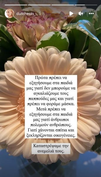 «Πρώτα πρέπει να εξηγήσουμε στα παιδιά μας γιατί δεν μπορούμε να αγκαλιάζουμε τους παππούδες μας και γιατί πρέπει να φοράμε μάσκα. Μετά πρέπει να εξηγήσουμε στα παιδιά μας γιατί άνθρωποι πολεμούν ανθρώπους. Γιατί χάνονται σπίτια και ξεκληρίζονται οικογένειες. Καταστρέψαμε την ανεμελιά τους» έγραψε η Δούκισσα Νομικού σε μία ανάρτηση που έκανε στα Instastories της.