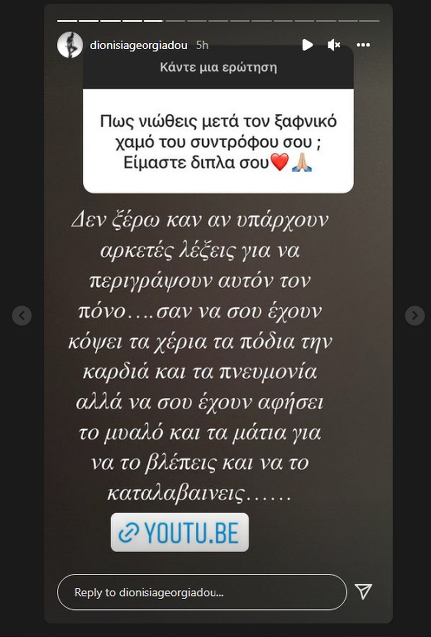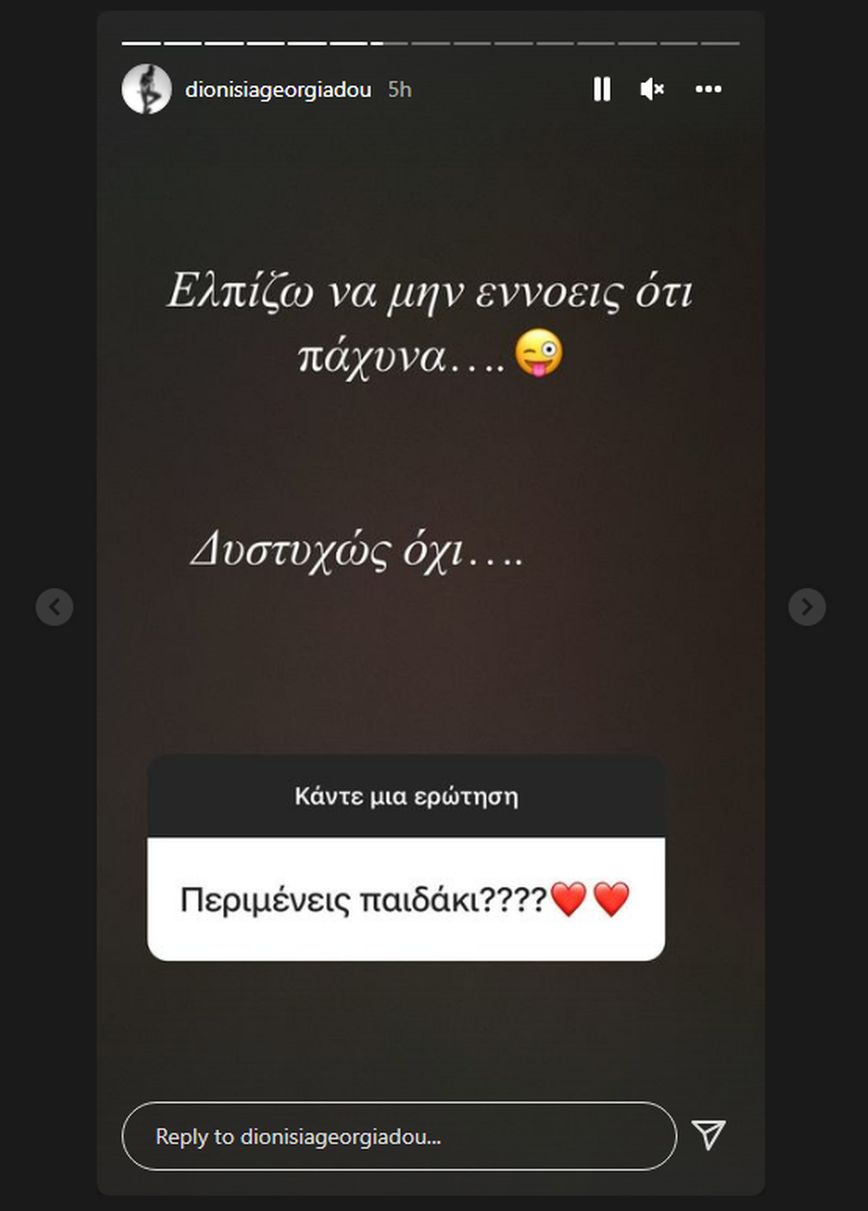«Ελπίζω να μην εννοείς ότι πάχυνα… Δυστυχώς όχι», έγραψε η Διονυσία Γεωργιάδου, διαψεύδοντας τις φήμες πως περιμένει παιδί.