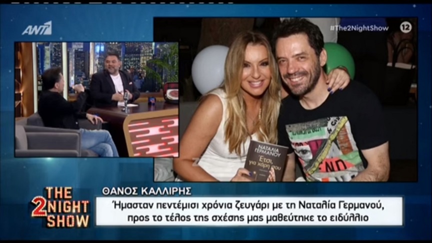 «Ήμασταν πεντέμισι χρόνια… σκλαβιά εεε… ζευγάρι με την Ναταλία Γερμανού. Προς το τέλος της σχέσης μας μαθεύτηκε το ειδύλλιο. Τότε δεν υπήρχε showbiz όπως την ξέρουμε τώρα, ο κόσμος δεν ασχολούταν. Μη κοιτάς που τώρα είναι η Γερμανού η φίρμα, τότε δεν την ήξεραν. Εγώ τη γαλούχησα, στα πόδια μου μεγάλωσε» αποκάλυψε ο Θάνος Καλλίρης.