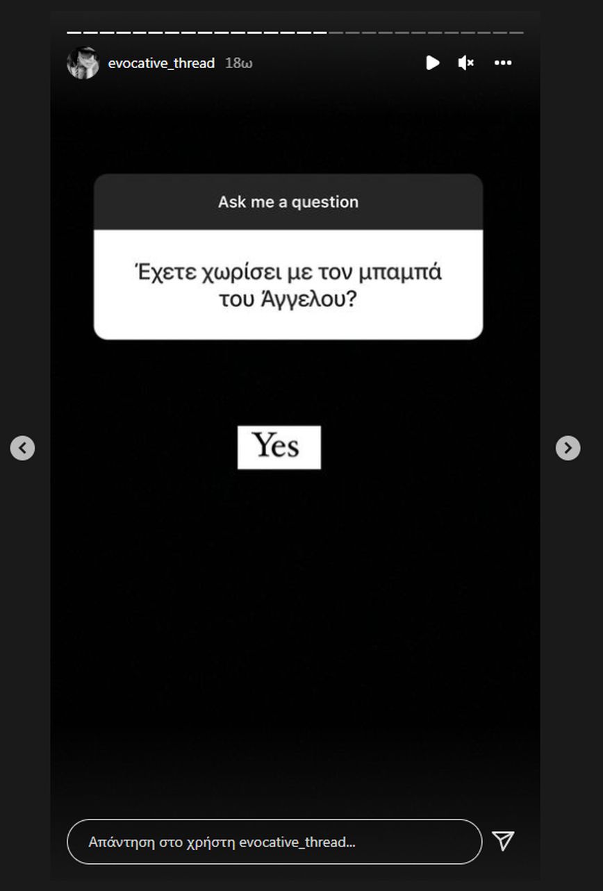Η είδηση του χωρισμού του Σταύρου Σβήγκου με την Ελένη Αϊβαλή ήρθε μέσω ενός Q&A το οποίο πραγματοποίησε η φωτογράφος στον προσωπικό της λογαριασμό στο Instagram. «Έχετε χωρίσει με τον μπαμπά του Άγγελου;» ήταν η ερώτηση που δέχθηκε η φωτογράφος.