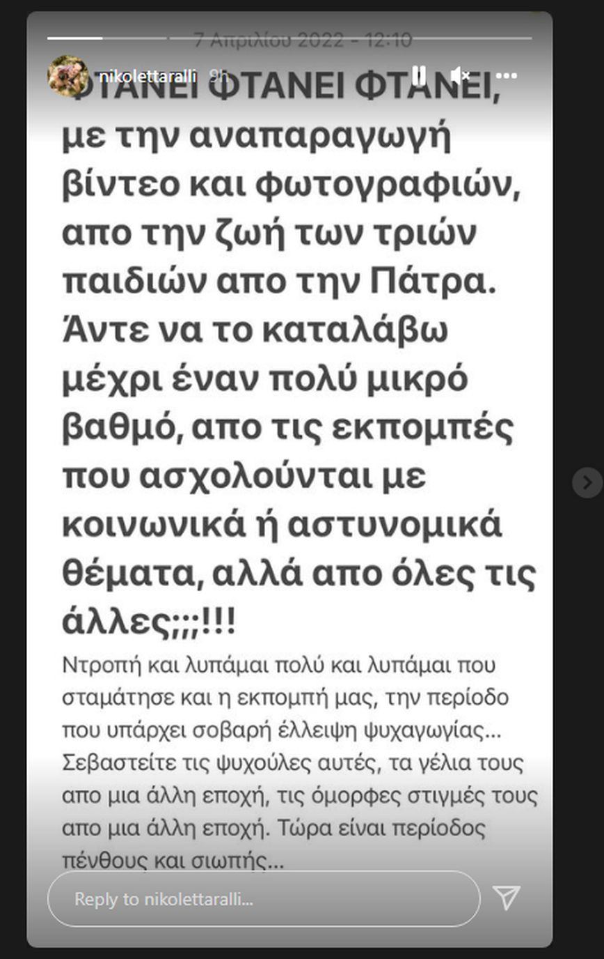 «Φτάνει, φτάνει, φτάνει με την αναπαραγωγή βίντεο και φωτογραφιών από τη ζωή των τριών παιδιών στην Πάτρα. Άντε να το καταλάβω μέχρι έναν πολύ μικρό βαθμό από τις εκπομπές που ασχολούνται με κοινωνικά ή αστυνομικά θέματα, αλλά από όλες τις άλλες;» έγραψε αρχικά η Νικολέττα Ράλλη.