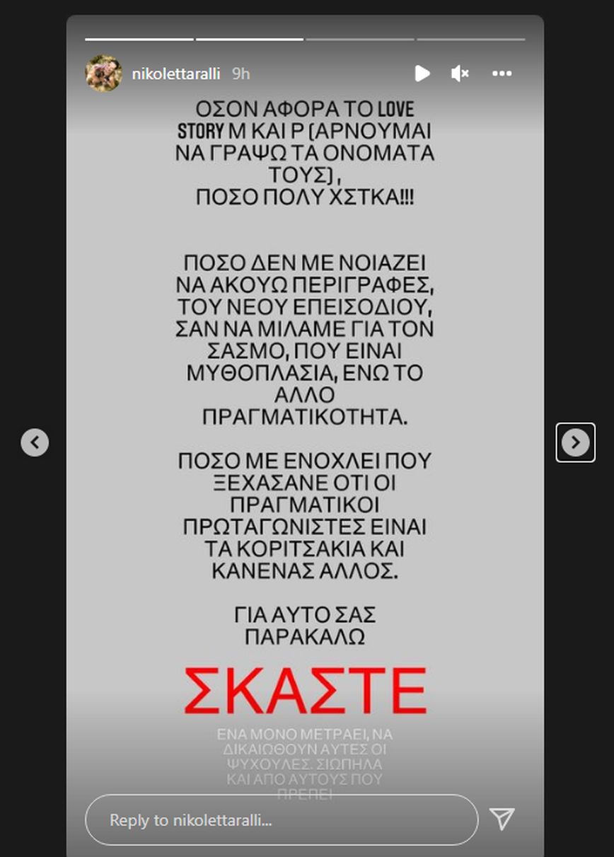 «Ντροπή και λυπάμαι πολύ, και λυπάμαι και που σταμάτησε η εκπομπή μας, την περίοδο που υπάρχει σοβαρή έλλειψη ψυχαγωγίας. Σεβαστείτε τις ψυχούλες αυτές, τα γέλια τους από μια άλλη εποχή, τις όμορφες στιγμές τους από μια άλλη εποχή. Τώρα είναι περίοδος πένθους και σιωπής. Όσον αφορά το Love Story του Μ και της Ρ (αρνούμαι να γράψω τα ονόματά τους), πόσο πολύ χ…α. Πόσο πολύ δε με νοιάζει να ακούω περιγραφές, του νέου επεισοδίου, σαν να μιλάμε για τον Σασμό που είναι μυθοπλασία, ενώ το άλλο πραγματικότητα. Πόσο με ενοχλεί που ξεχάσανε ότι πραγματικοί πρωταγωνιστές είναι τα κοριτσάκια και κανένας άλλος» σχολίασε η παρουσιάστρια.
