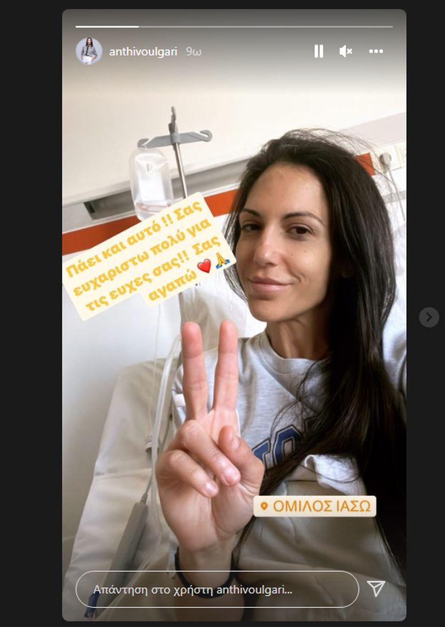 «Πάει κι αυτό! Σας ευχαριστώ πολύ για τις ευχές σας, σας αγαπώ» έγραψε η Ανθή Βούλγαρη στο κείμενο που συνόδευε τη φωτογραφία της από το κρεβάτι του νοσοκομείου.