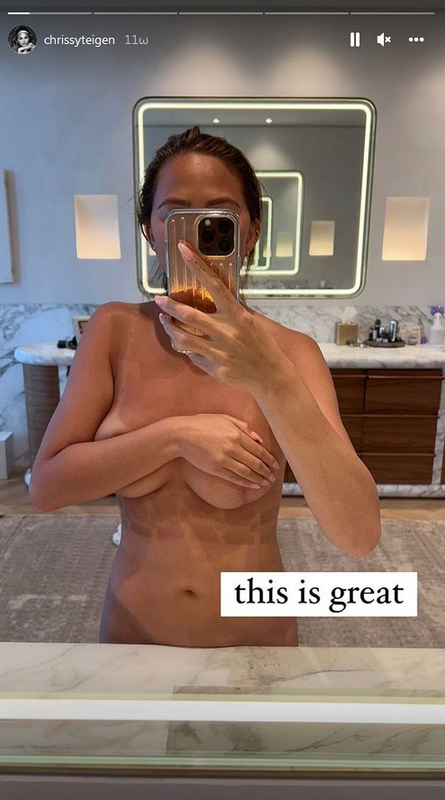 Η Κρίστι στέκεται μπροστά από έναν νιπτήρα γυμνή, κρύβοντας με τα χέρια το στήθος της. «Είναι υπέροχο», έγραψε στη λεζάντα που συνόδεψε τη φωτογραφία.