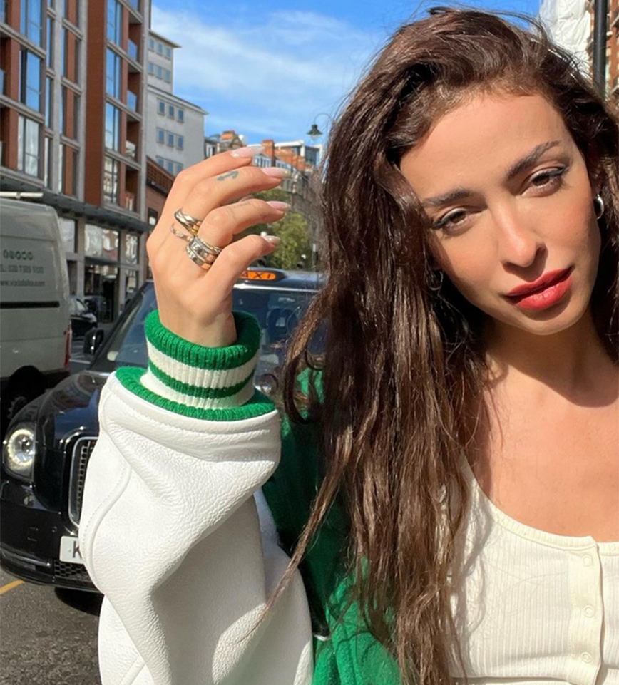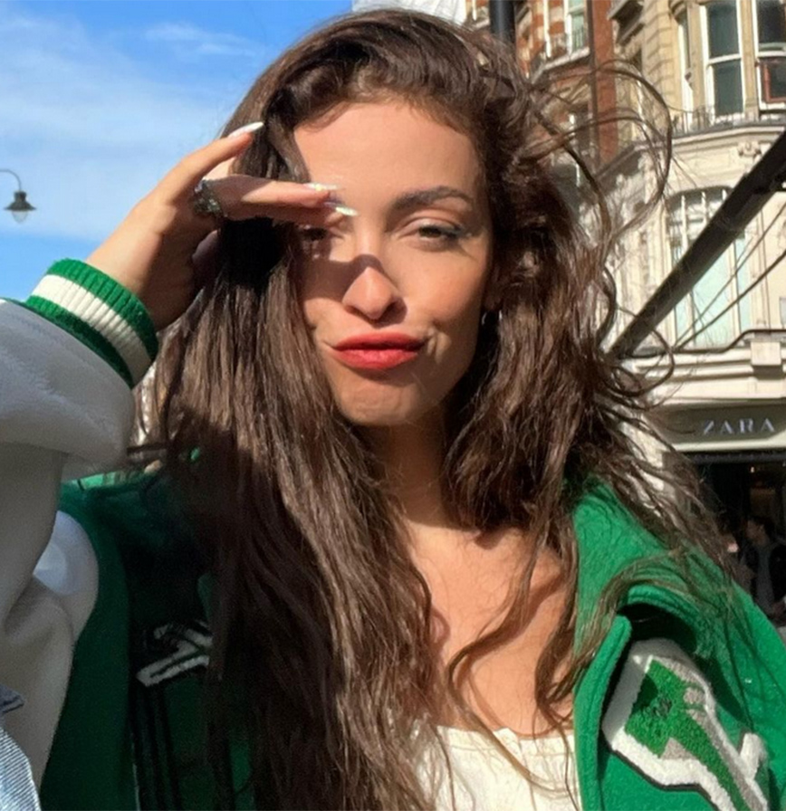 Η Ελένη Φουρέιρα φορά ένα λευκό τοπ, με λευκή φόρμα τα οποία συνδύασε με ένα κολεγιακό τζάκετ σε πράσινο χρώμα με λευκές λεπτομέρειες.