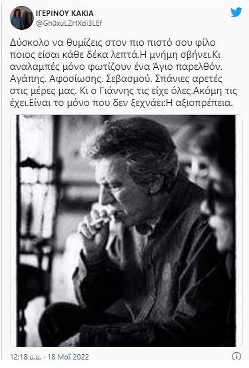 «Δύσκολο να θυμίζεις στον πιο πιστό σου φίλο ποιος είσαι κάθε δέκα λεπτά. Η μνήμη σβήνει. Κι αναλαμπές μόνο φωτίζουν ένα Άγιο παρελθόν. Αγάπης. Αφοσίωσης. Σεβασμού. Σπάνιες αρετές στις μέρες μας. Κι ο Γιάννης τις είχε όλες. Ακόμη τις έχει. Είναι το μόνο που δεν ξεχνάει: Η αξιοπρέπεια», έγραψε η Κάκια Ιγερινού, προσθέτοντας, μάλιστα, σε σχόλιο ότι η ανάρτηση έγινε μετά από επιθυμία του ηθοποιού.