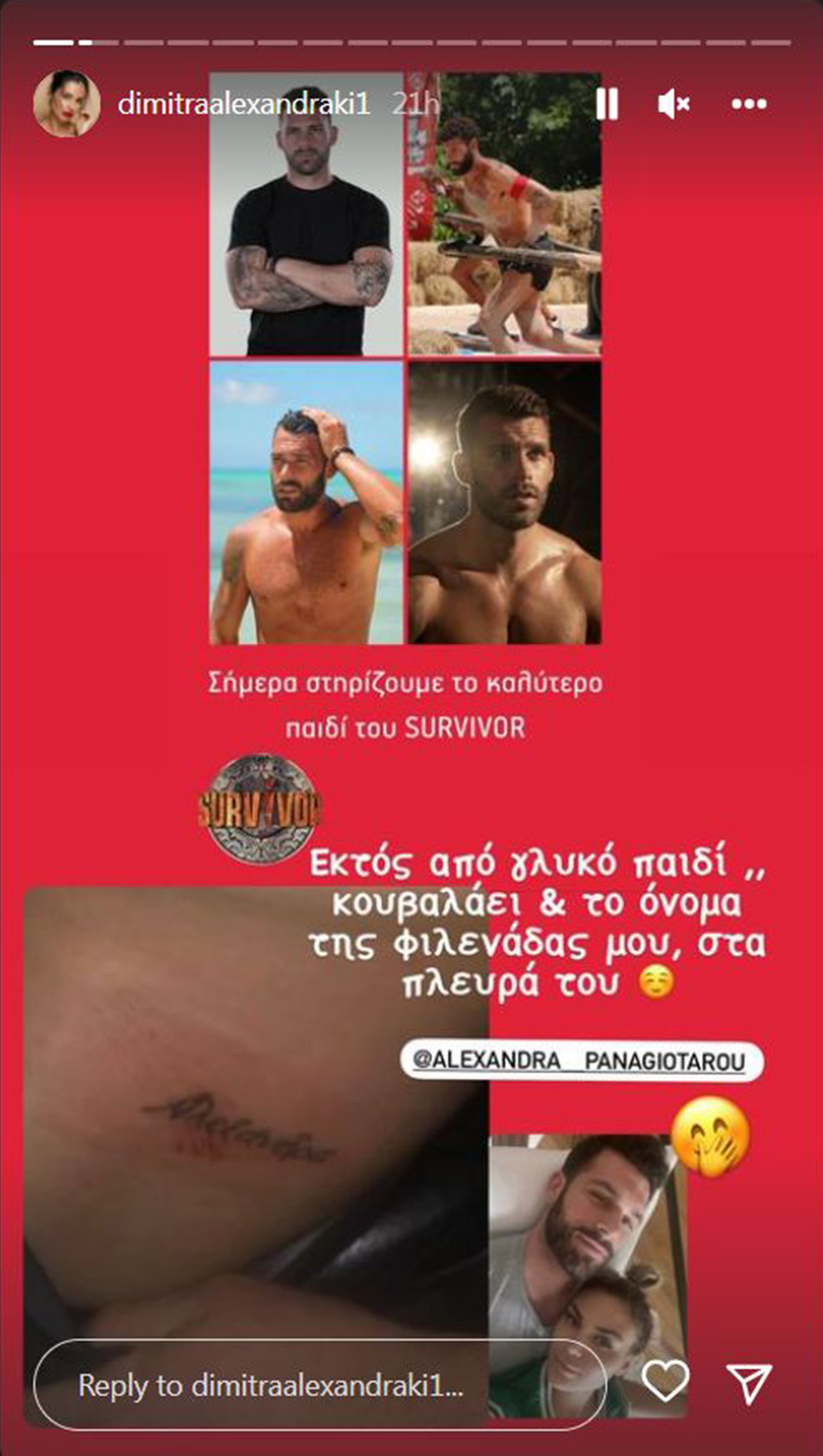 Τώρα όμως ήρθε η στιγμή, που η σχέση τους επιβεβαιώθηκε και μάλιστα από δυο πλευρές. Την αρχή έκανε, το βράδυ της Τετάρτης (18/05) η καλή φίλη του ζευγαριού, Δήμητρα Αλεξανδράκη, η οποία θέλησε να στηρίξει τον Στάθη Σχίζα ο οποίος είναι υποψήφιος προς αποχώρηση από το Survivor. Έτσι, το μοντέλο δημοσίευσε φωτογραφίες του Στάθη Σχίζα από το Survivor και παρότρυνε τους διαδικτυακούς του φίλους να τον στηρίξουν ώστε να παραμείνει στον Άγιο Δομίνικο. Μαζί όμως με την παρότρυνση ήρθε και η αποκάλυψη αφού η Δήμητρα Αλεξανδράκη έγραψε πως ο Στάθης Σχίζας έχει στα πλευρά του τατουάζ με το όνομα της Αλεξάνδρα Παναγιώταρου και δημοσίευσε και τις σχετικές φωτογραφίες.
