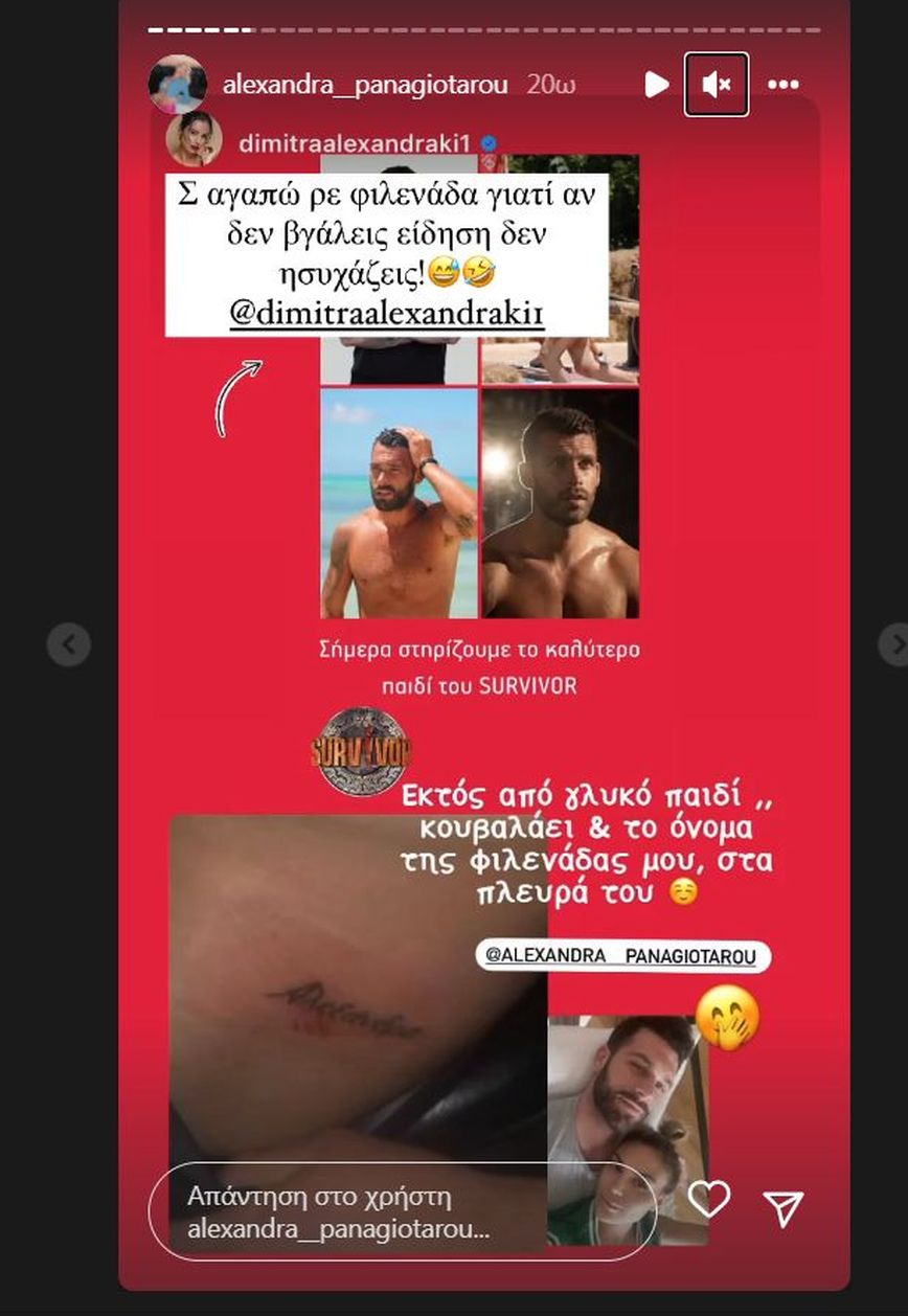 Και μπορεί η Αλεξάνδρα Παναγιώταρου μέχρι χθες να μην είχε επιβεβαιώσει την σχέση της με τον Στάθη Σχίζα, μετά την ανάρτηση της Δήμητρας Αλεξανδράκη άλλαξε στάση. Αφού λοιπόν έκανε repost τη δημοσίευση της Δήμητρας Αλεξανδράκη έγραψε πως την αγαπά γιατί αν δεν βγάλει την είδηση δεν ησυχάζει ενώ στην συνέχεια προχώρησε στη δημοσίευση ορισμένων βίντεο των δυο τους.