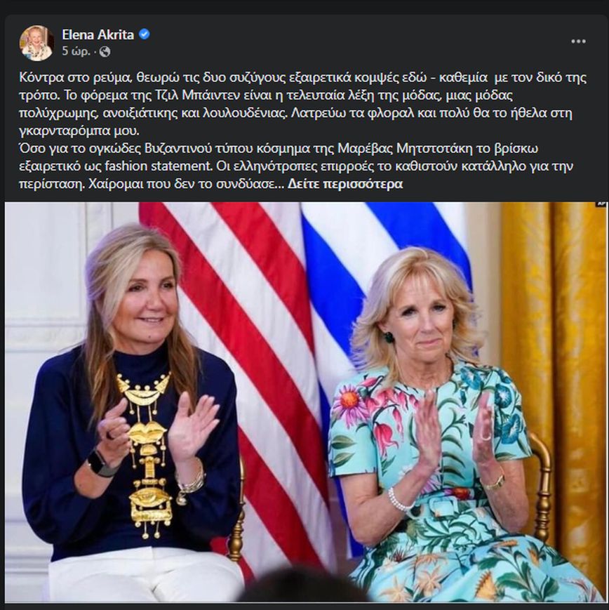 Τις ενδυματολογικές επιλογές της Μαρέβας Μητσοτάκη και της Τζιλ Μπάιντεν σχολίασε η Έλενα Ακρίτα. Η δημοσιογράφος προχώρησε σε ένα παραπολιτικό σχόλιο σχετικά με την επίσκεψη του πρωθυπουργού Κυριάκου Μητσοτάκη στην Ουάσιγκτον.