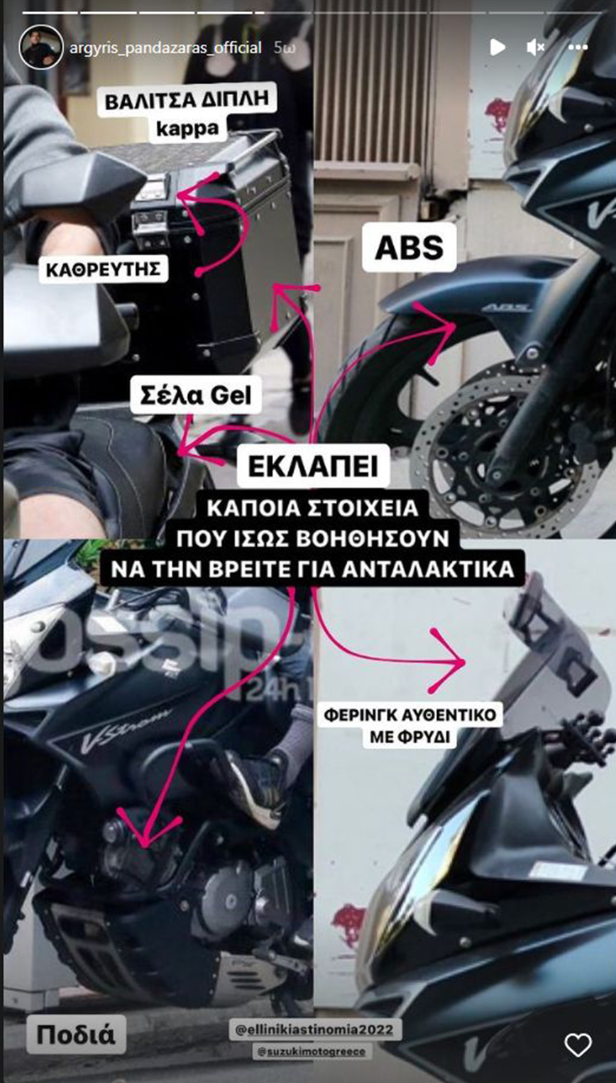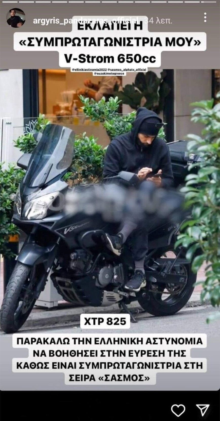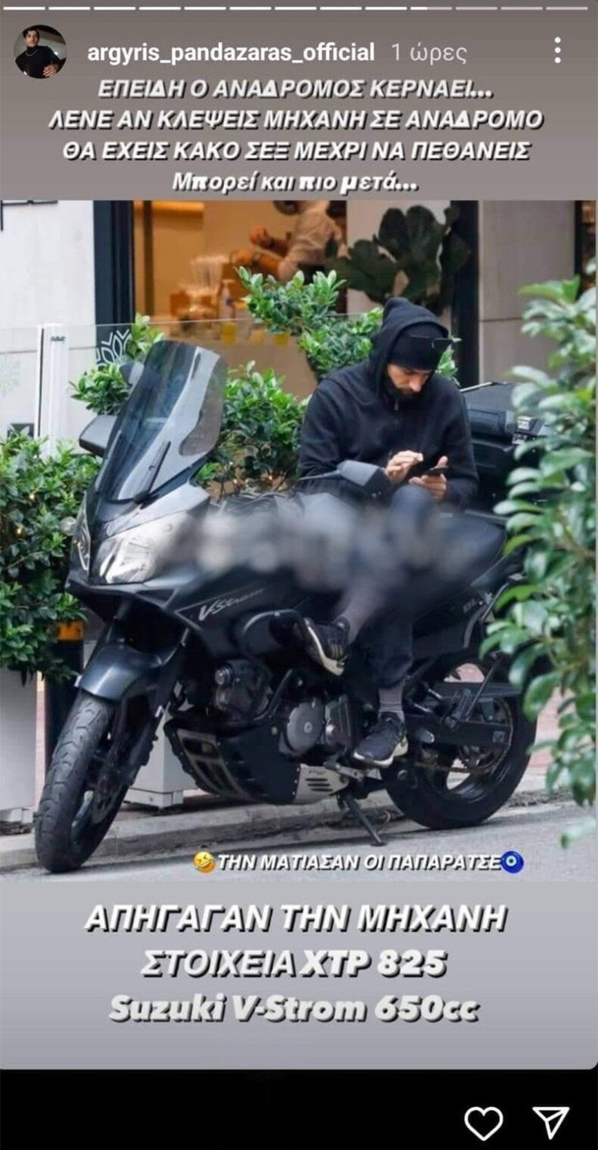 Ο Αργύρης Πανταζάρας έκανε γνωστό το συμβάν και μοιράστηκε τον αριθμό της πινακίδας της μηχανής του με τους διαδικτυακούς του φίλους, σε περίπτωση που κάποιος μπορεί να τον βοηθήσει.