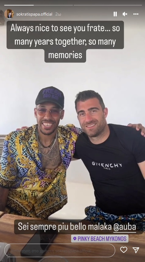 Διακοπές για τους παίκτες του Ολυμπιακού, πλην των διεθνών ασφαλώς, μέχρι την έναρξη της προετοιμασίας στον Ρέντη στις 14 Ιουνίου. Στη Μύκονο, λοιπόν, περνάει χαλαρές και ξέγνοιαστες ημέρες ο Σωκράτης Παπασταθόπουλος. Στο νησί των Ανέμων για να γεμίσει τις μπαταρίες του βρίσκεται και ο Πιέρ-Εμερίκ Ομπαμεγιάνγκ. Ο αμυντικός των «ερυθρολεύκων» συνάντησε στο κυκλαδίτικο νησί τον καλό του φίλο, άλλοτε συμπαίκτη του στην Άρσεναλ και την Ντόρτμουντ.