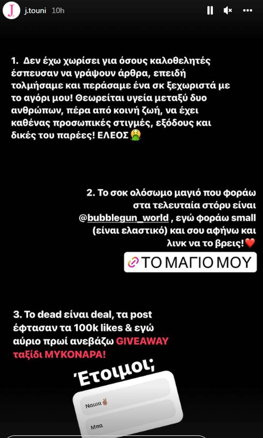 Απάντηση στις φήμες που κάνουν λόγο για χωρισμό με τον Δημήτρη Αλεξάνδρου έδωσε η Ιωάννα Τούνη με ένα story που ανάρτησε στον προσωπικό της λογαριασμό στο Instagram. Το ζευγάρι πέρασε το τριήμερο του Αγίου Πνεύματος σε διαφορετικούς προορισμούς, με αποτέλεσμα οι σχετικές φήμες να φουντώσουν.