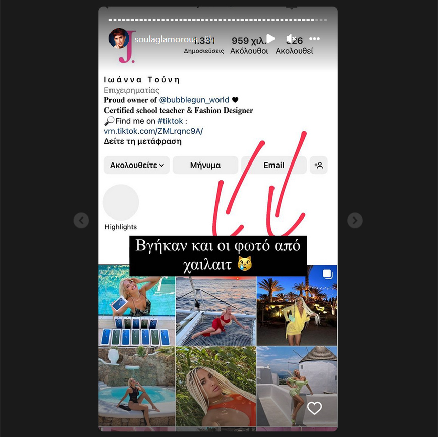 Θαυμαστές της Soula Glamorous σε συνομιλία που είχαν μαζί της επεσήμαναν πως είδαν κινήσεις που τους προβλημάτισαν και τόνισαν πως η Ιωάννα Τούνη και ο Δημήτρης Αλεξάνδρου έχουν σβήσει ο ένας τον άλλο από το Instagram και έχουν αφαιρέσει επίσης όλα τα tag από τις κοινές τους φωτογραφίες.