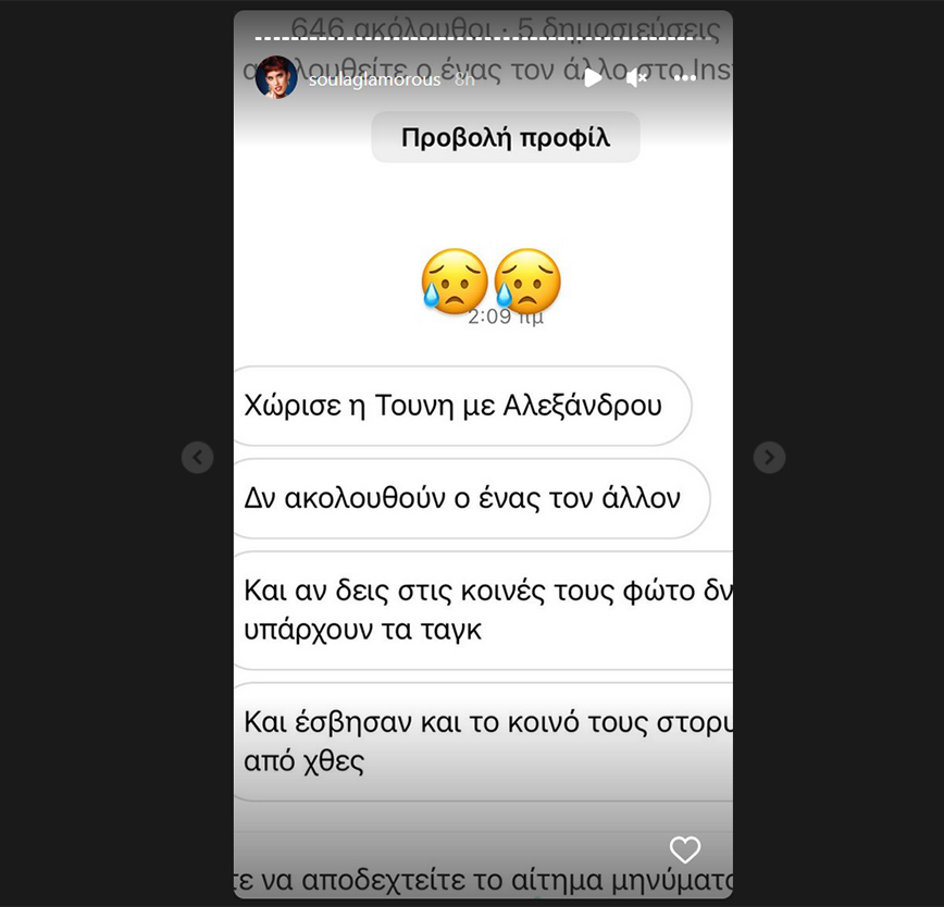 Η είδηση πως ο ένας σταμάτησε να ακολουθεί τον άλλον στα social media έγινε γνωστή από το προφίλ της Soula Glamorous στο Instagram.