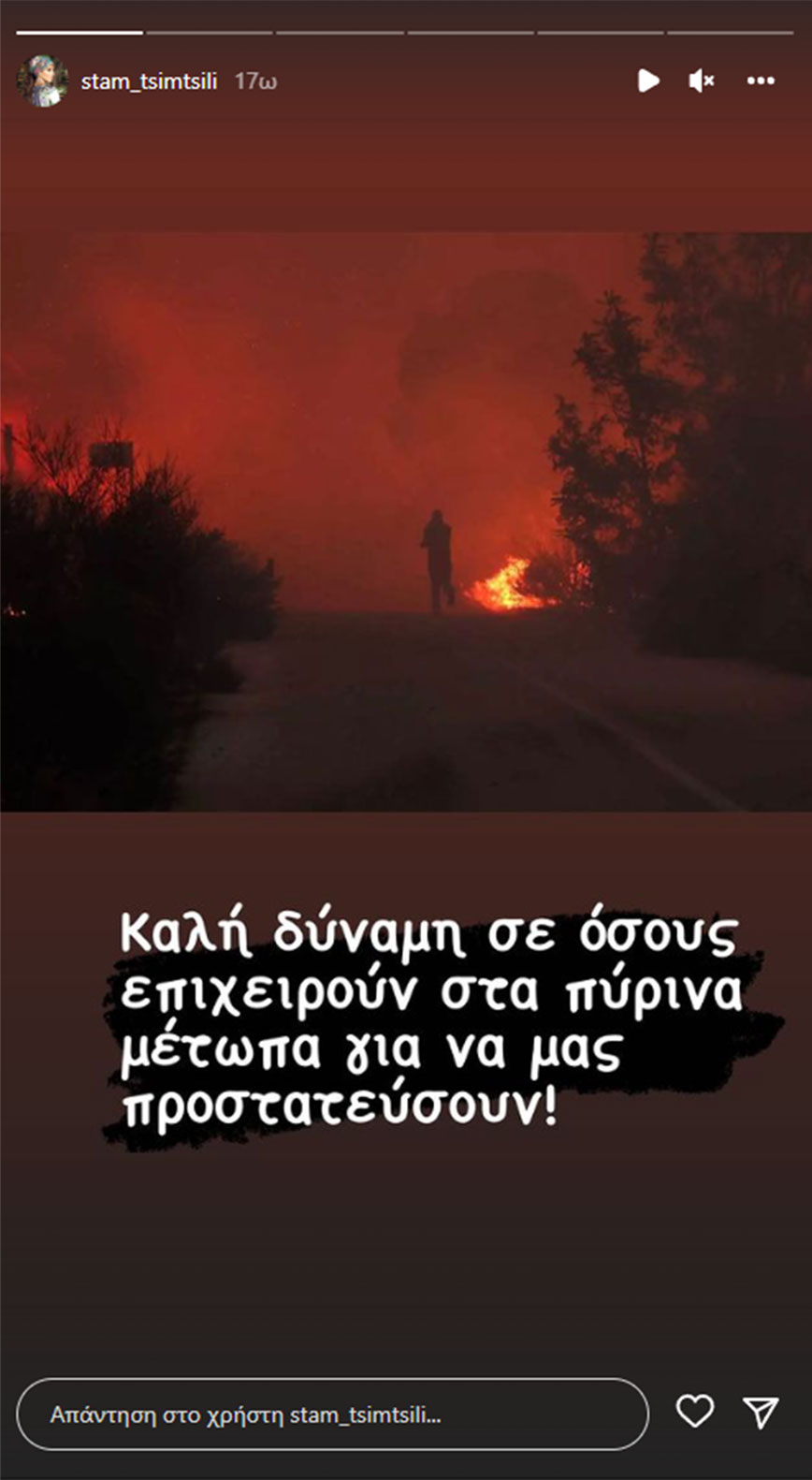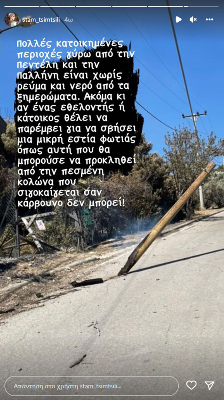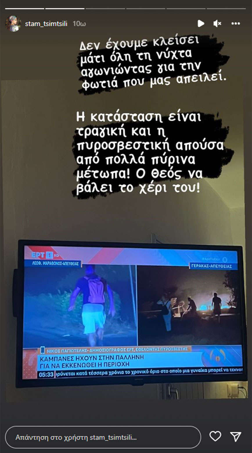 «Δεν έχουμε κλείσει μάτι όλη τη νύχτα αγωνιώντας για την φωτιά που μας απειλεί. Η κατάσταση είναι τραγική και η πυροσβεστική απούσα από πολλά πύρινα μέτωπα! Ο Θεός να βάλει το χέρι του» σημείωσε χαρακτηριστικά η Σταματίνα Τσιμτσιλή στην ιστορία που δημοσίευσε στον προσωπικό της λογαριασμό στο Instagram.