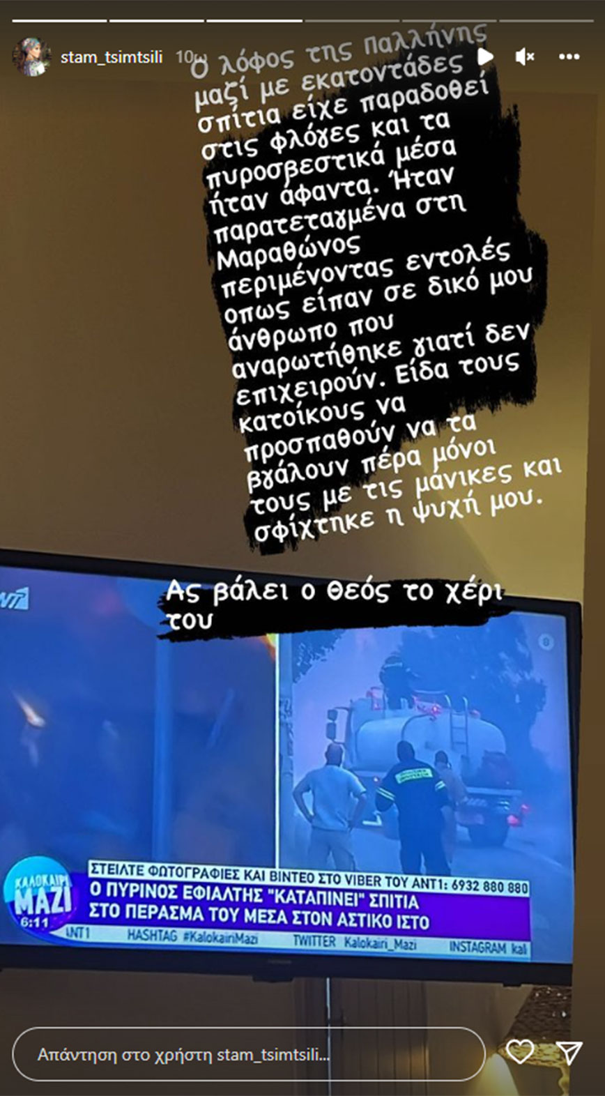Μέσω του προσωπικού της λογαριασμού στο instagram, η Σταματίνα Τσιμτσιλή μοιράστηκε με τους διαδικτυακούς της φίλους τις σκέψεις και την έντονη ανησυχία της για τη φωτιά στην Πεντέλη.