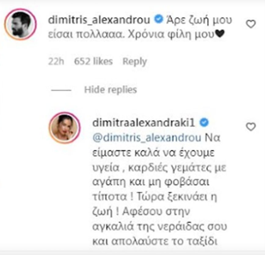 «Άρε ζωή μου είσαι πολλααα. Χρόνια φίλη μου» έγραψε ο Δημήτρης Αλεξάνδρου και η Δήμητρα Αλεξανδράκη του απάντησε: «Να είμαστε καλά να έχουμε υγεία , καρδιές γεμάτες με αγάπη και μη φοβάσαι τίποτα ! Τώρα ξεκινάει η ζωή ! Αφέσου στην αγκαλιά της νεράιδας σου και απολαύστε το ταξίδι χωρίς να σας ενδιαφέρει τίποτα άλλο».