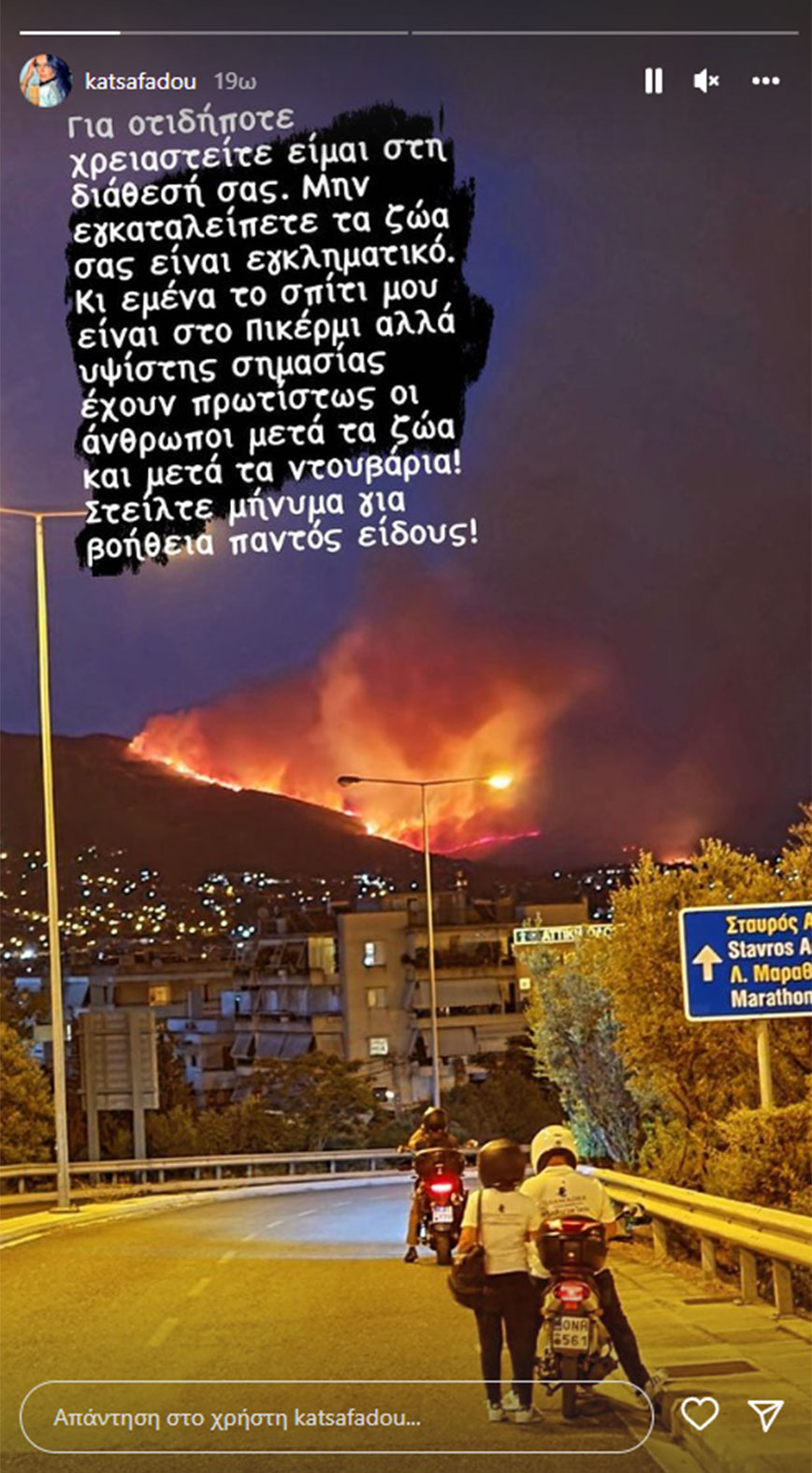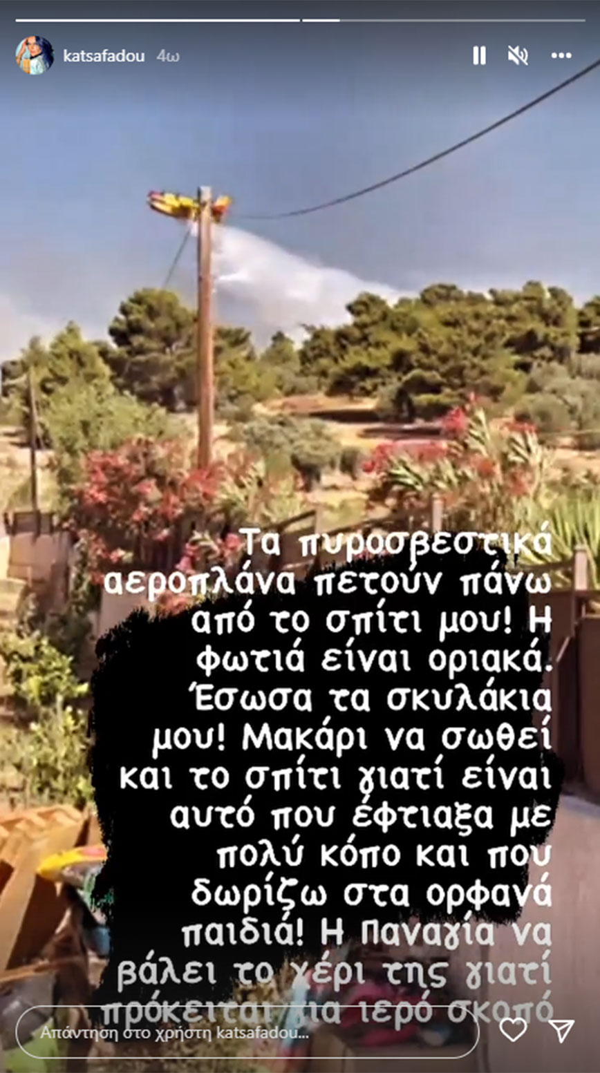 Τραβώντας σε φωτογραφία τη φωτιά από την περιοχή που βρίσκεται το σπίτι της στο Πικέρμι η Δήμητρα Κατσαφάδου έγραψε: «Για οτιδήποτε χρειαστείτε είμαι στη διάθεσή σας. Μην εγκαταλείπετε τα ζώα σας είναι εγκληματικό. Κι εμένα το σπίτι μου είναι στο Πικέρμι αλλά υψίστης σημασίας έχουν πρωτίστως οι άνθρωποι, μετά τα ζώα και μετά τα ντουβάρια. Στείλτε μήνυμα για βοήθεια παντός είδους».