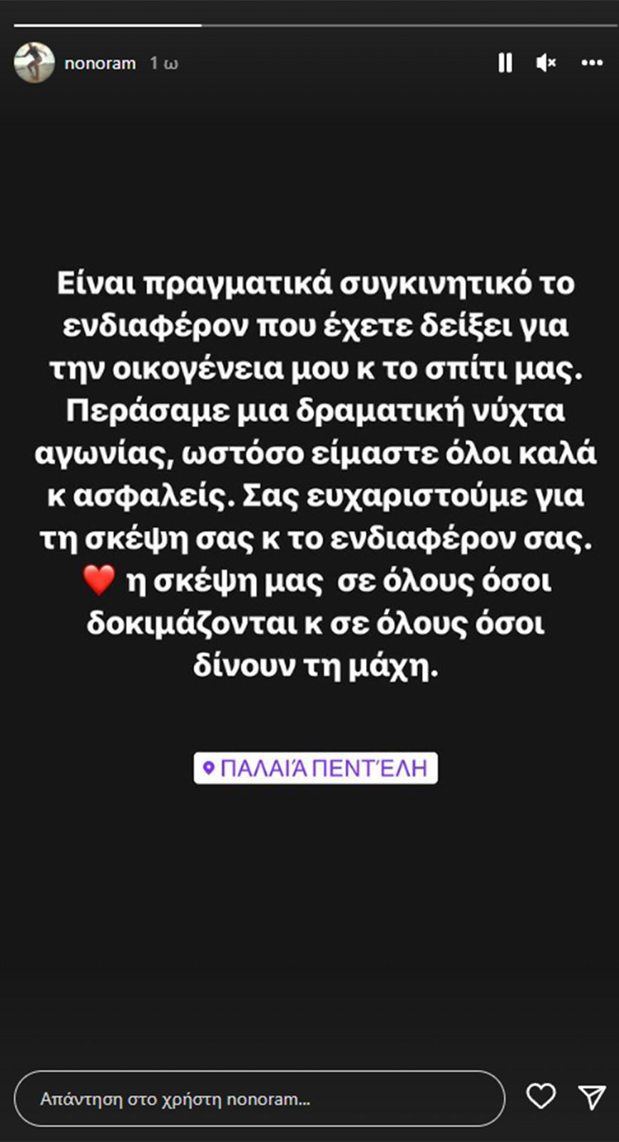 «Είναι πραγματικά συγκινητικό το ενδιαφέρον που έχετε δείξει για την οικογένειά μου και το σπίτι μας. Περάσαμε μια δραματική νύχτα αγωνίας, ωστόσο είμαστε όλοι καλά και ασφαλείς. Σας ευχαριστούμε για την σκέψη σας και τον ενδιαφέρον σας. Η σκέψη μας σε όλους όσους δοκιμάζονται και σε όλους όσους δίνουν την μάχη» έγραψε η Ελεονώρα Μελέτη.