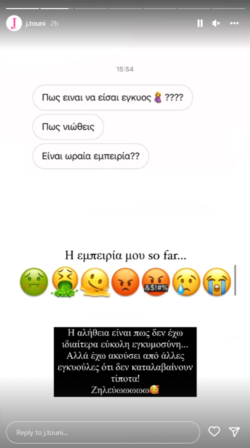 Η Ιωάννα Τούνη απάντησε σε διαδικτυακό της φίλο που την ρώτησε πως νιώθει που είναι έγκυος γράφοντας: «Η αλήθεια είναι πως δεν έχω ιδιαίτερα εύκολη εγκυμοσύνη… Αλλά έχω ακούσει από άλλες εγκυούλες ότι δεν καταλαβαίνουν τίποτα. Ζηλεύωωωωω…».