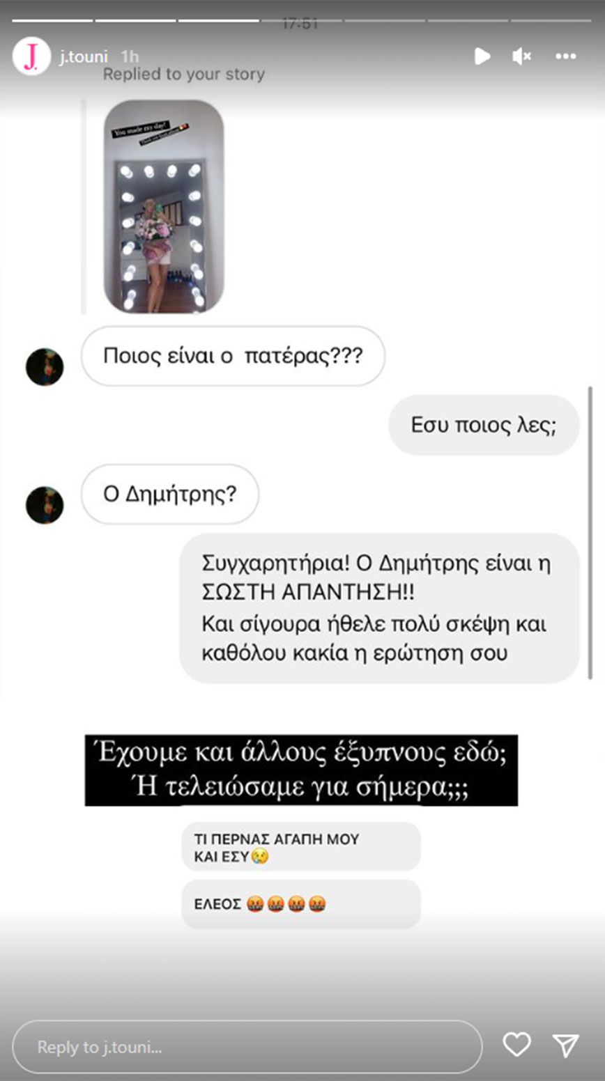 «Ποιος είναι ο πατέρας;» έγραφε το μήνυμα που δέχθηκε η Ιωάννα Τούνη και εκείνη προτίμησε να απαντήσει λιτά: «εσύ ποιος λες;». Ο διαδικτυακός της φίλος συνέχισε. «Ο Δημήτρης;» την ρώτησε. «Συγχαρητήρια. Ο ΔΗΜΗΤΡΗΣ είναι η σωστή απάντηση!!! Και σίγουρα ήθελε πολύ σκέψη και καθόλου κακία η ερώτηση σου» απάντησε η inflluencer.