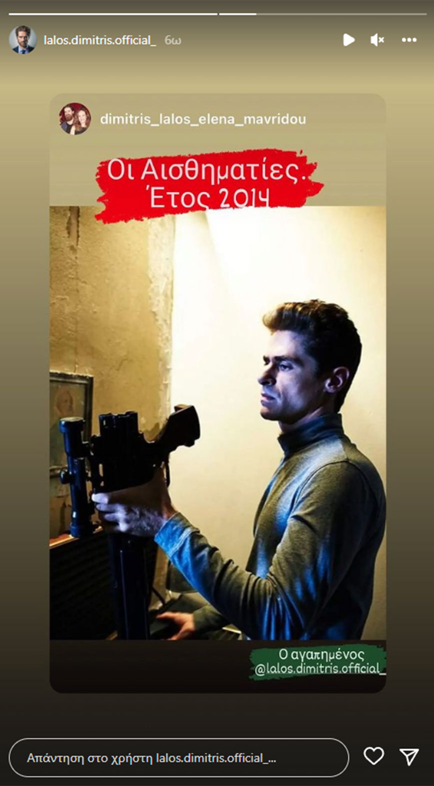 Στο στιγμιότυπο που ανάρτησε μέσω Instagram Stories, εμφανίζεται ο ίδιος στα γυρίσματα της ταινίας «Αισθηματίες» του 2014, να κάθεται μπροστά από μία κάμερα. Η αλλαγή στην εμφάνισή του είναι εμφανής, αφού στη φωτογραφία από τα παλιά ο Δημήτρης Λάλος δεν παραπέμπει και τόσο στον «Μαθιό».