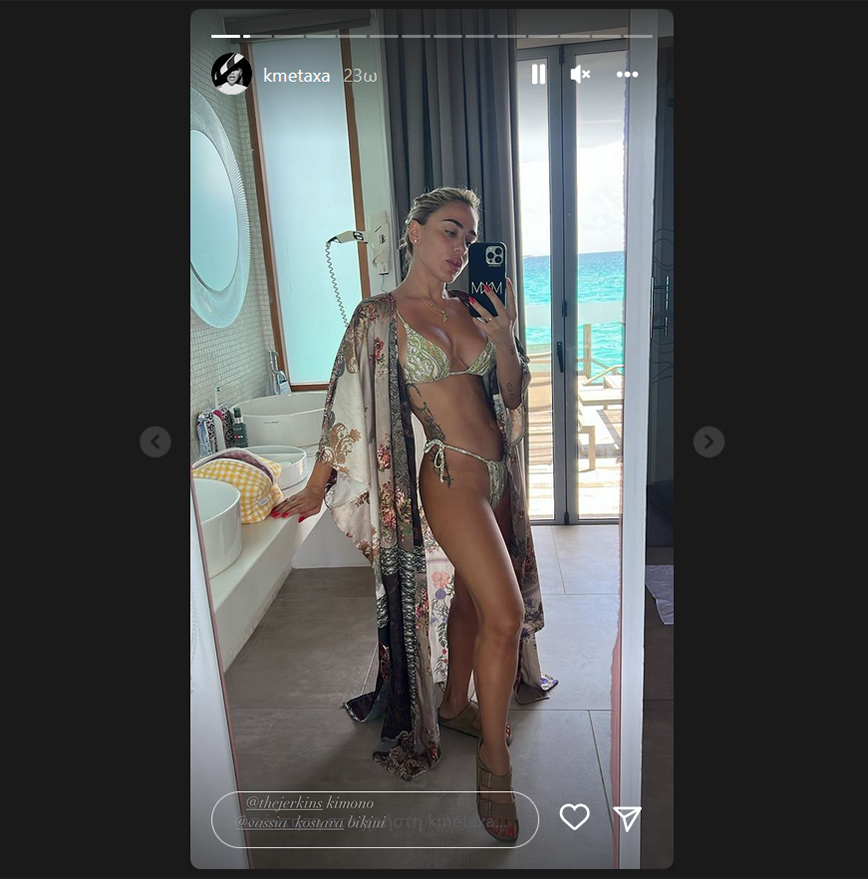 Η Influencer ανεβάζει συνεχώς φωτογραφίες αλλά και stories από τον μαγευτικό προορισμό που επέλεξε να ταξιδέψει, λίγες μέρες μετά τον εντυπωσιακό γάμο της. Σe μία φωτογραφία, ποζάρει με ένα πράσινο μαγιό και φόντο το απέραντο γαλάζιο ενώ στην άλλη επέλεξε ένα πράσινο μακρύ φόρεμα με φόντο τους φοίνικες.