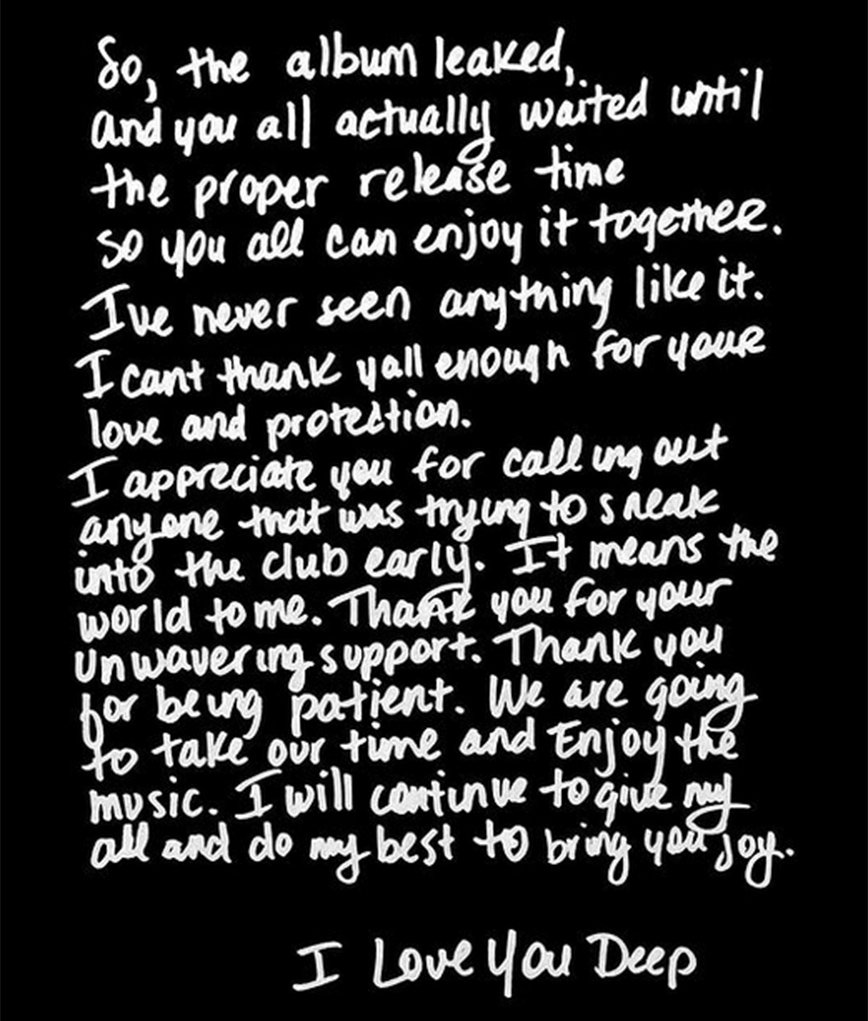 «Δεν μπορώ να σας ευχαριστήσω όλους αρκετά για την αγάπη και την προστασία […] Λοιπόν το άλμπουμ διέρρευσε και όλοι σας περιμένατε μέχρι τη σωστή ημερομηνία κυκλοφορίας για να το απολαύσουμε μαζί. Δεν έχω ξαναδεί κάτι τέτοιο», σημείωσε, τονίζοντας ότι «σημαίνει τα πάντα» για εκείνη το γεγονός ότι οι θαυμαστές της περιμέναν.