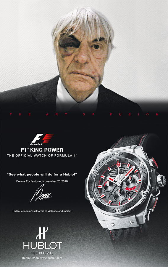 «Δείτε τι μπορεί να κάνει κάποιος για ένα Hublot», είναι το σλόγκαν της διαφήμισης, ενώ ο Έκλεστον φιγουράρει με μαυρισμένο μάτι. Το εντυπωσιακό της υπόθεσης είναι ότι εκτός από την επίθεση που δέχτηκε του έκλεψαν και ένα ρολόι της εν λόγω εταιρίας!