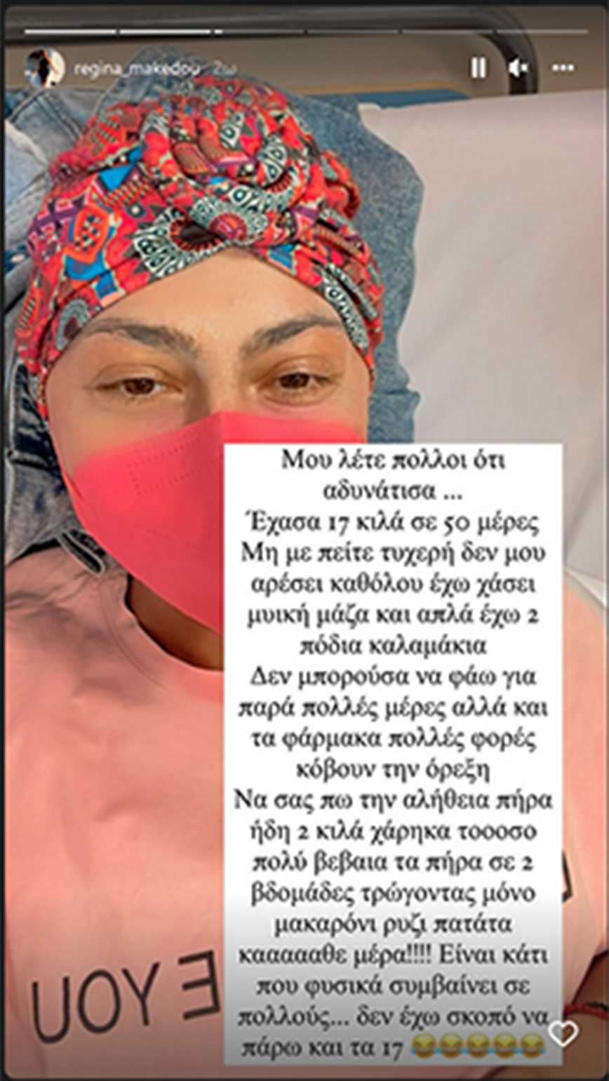 Σε μία κατάθεση ψυχής που συγκλονίζει προχώρησε με μία σειρά από stories στο Instagram η χορεύτρια και γυμνάστρια Ρεγγίνα Μακέδου η οποία δίνει μάχη με τον καρκίνο. «Το ότι βγαίνω φωτογραφίες δεν σημαίνει ότι είμαι καλά» επεσήμανε και αποκάλυψε πως μέσα σε 50 ημέρες έχασε 17 κιλά.