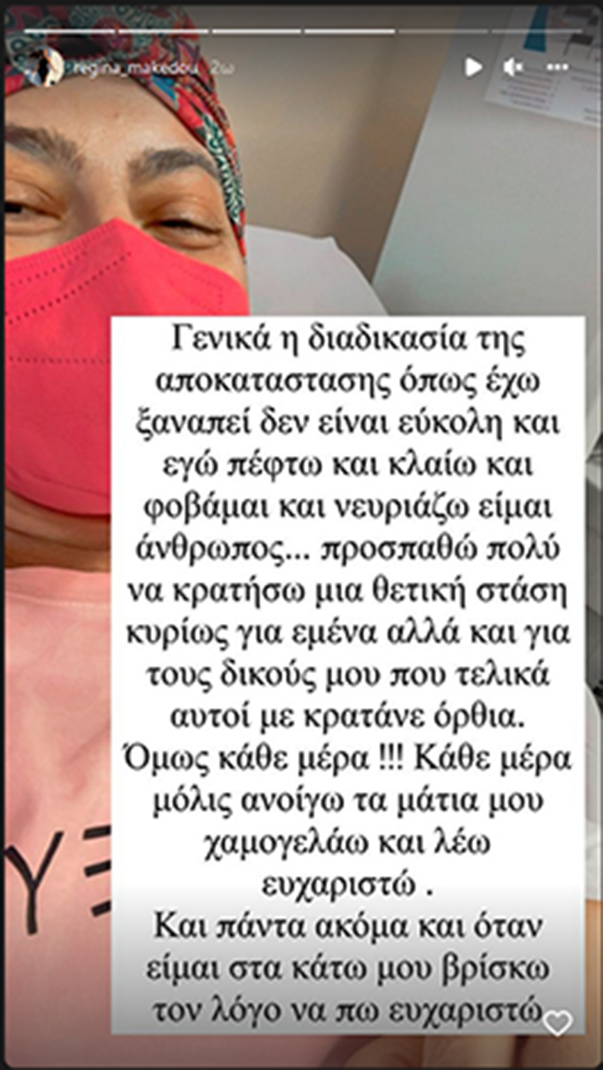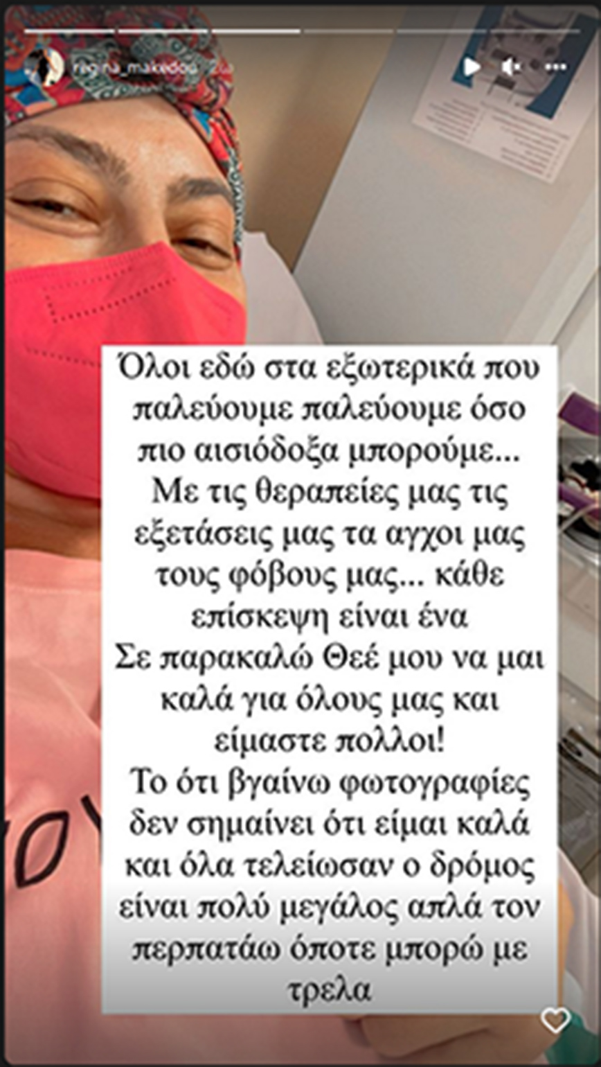 Το ότι βγαίνω φωτογραφίες δεν σημαίνει ότι είμαι καλά και όλα τελείωσαν. Ο δρόμος είναι πολύ μεγάλος, απλά τον περπατάω όποτε μπορώ με τρέλα» υπογράμμισε η Ρεγγίνα Μακέδου.