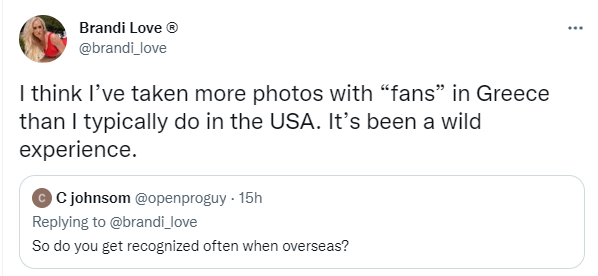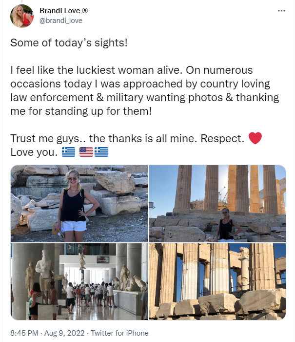 Στην Αθήνα για διακοπές βρίσκεται η διάσημη πορνοστάρ Brandi Love και με αναρτήσεις της στο twitter δείχνει τον ενθουσιασμό της για την Ελλάδα, αλλά και για τους θαυμαστές της στη χώρα μας.