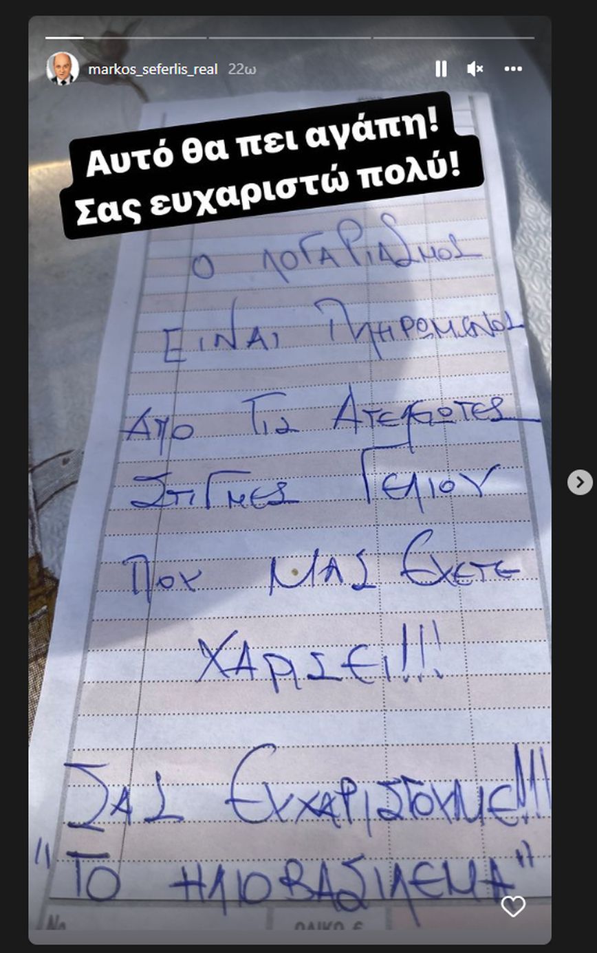 Σε ταβέρνα βρέθηκε ο Μάρκος Σεφερλής προκειμένου να απολαύσει το γεύμα του. Μετά το τέλος του φαγητού του, ο ηθοποιός ζήτησε το λογαριασμό, όμως δεν περίμενε αυτό που θα έβλεπε λίγη ώρα αργότερα. Ο σερβιτόρος αντί για το λογαριασμό ο οποίος θα ανάγραφε το αντίτιμο του φαγητού που καταναλώθηκε του πήγε ένα χαρτί από δελτίο παραγγελίας με ένα συγκινητικό μήνυμα γεμάτο αγάπη.