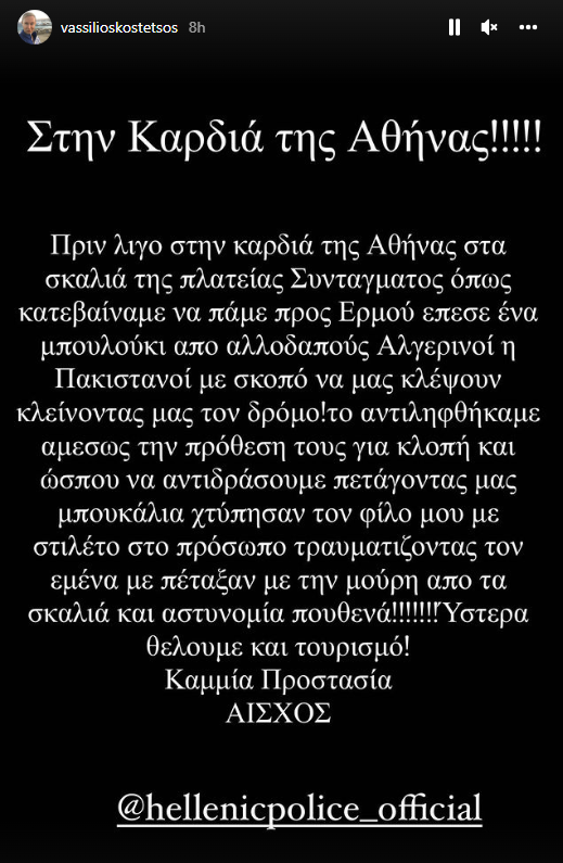 «Στην καρδιά της Αθήνας!! Πριν λίγο στα σκαλιά της πλατείας Συντάγματος όπως κατεβαίνουμε να πάμε προς Ερμού, έπεσε ένα μπουλούκι από αλλοδαπούς Αλγερινοί η Πακιστανοί με σκοπό να μας κλέψουν κλείνοντας μας τον δρόμο!
