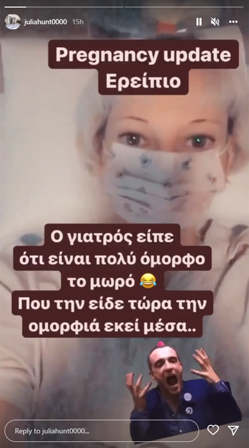 «Ενημέρωση εγκυμοσύνης. Ερείπιο. O γιατρός είπε ότι το μωρό είναι πολύ όμορφο» επεσήμανε σε νέο στόρι που ανέβασε στο Instagram η Τζούλια Αλεξανδράτου με βίντεο από την επίσκεψη στον γυναικολόγο της που της έκανε τον υπέρηχο.