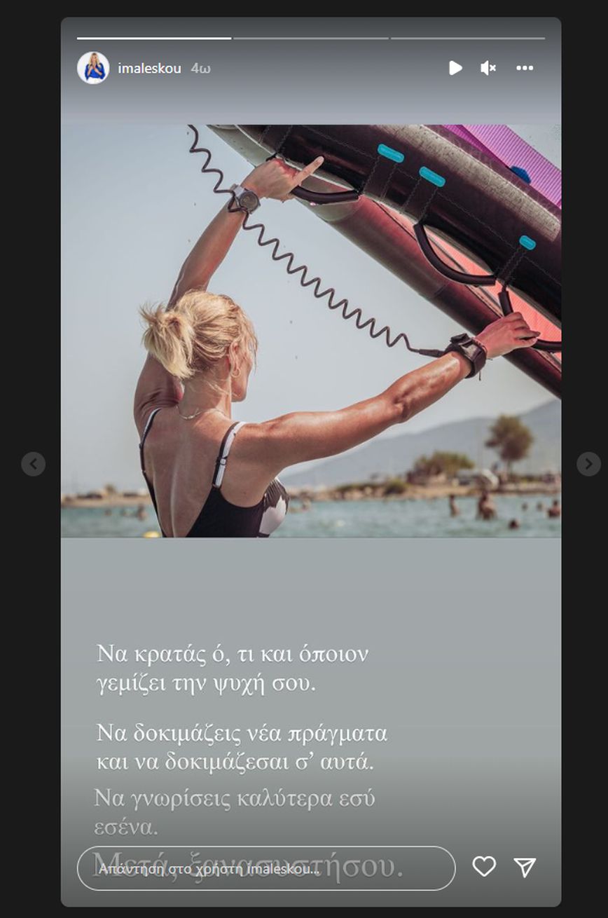 «Να κρατάς ό,τι κι όποιον γεμίζει τη ψυχή σου. Να δοκιμάζεις νέα πράγματα και να δοκιμάζεσαι σε αυτά. Να γνωρίζεις καλύτερα εσύ εσένα. Μετά, ξανασυστήσου» έγραψε η Ιωάννα Μαλέσκου σε ένα instastory που δημοσίευσε.