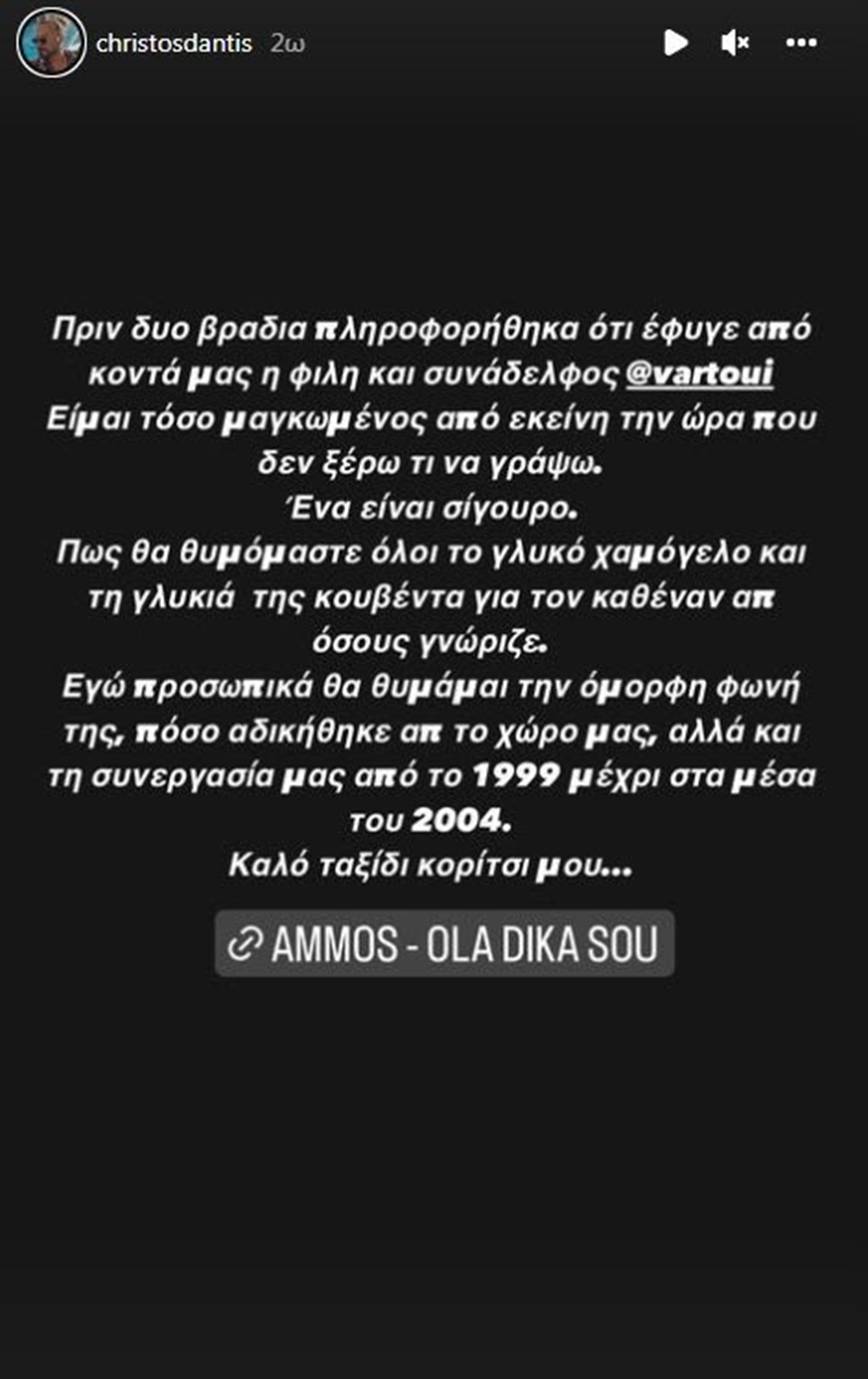 Όπως έκανε γνωστό ο Χρήστος Δάντης λογαριασμό του στο Instagram, πέθανε μια καλή του φίλη και συνάδελφος. Ο Χρήστος Δάντης την αποχαιρέτησε με μια συγκινητική ανάρτηση, αναφέροντας πως θα θυμάται την όμορφη φωνή της, το γεγονός ότι αδικήθηκε από τον χώρο και τη συνεργασία τους στο παρελθόν.